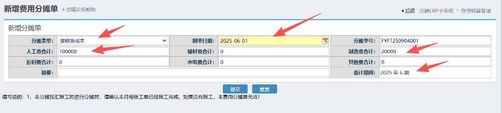 点击进入 如下图: 做费用分摊操作,每月填写一次,填入人工以及制造费用