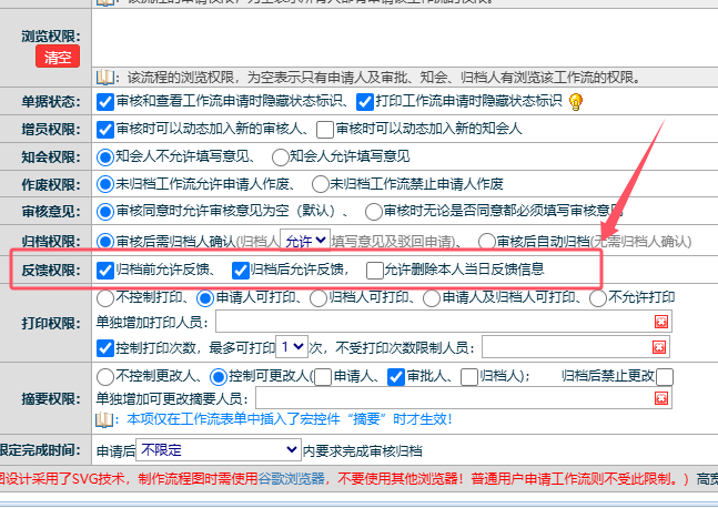 工作流申请归档后如何设置允许继续反馈内容? 以管理员身份登录点晴MIS系统,进入工作流模块-》流程管理,找到需要设置的流程,点击编辑:在流程设计的“反馈权限”中,勾选“归档后允许反馈”即可。