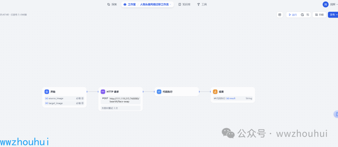 首先这个工作流由开始节点、HTTP 请求、代码处理、结束等3个节点。