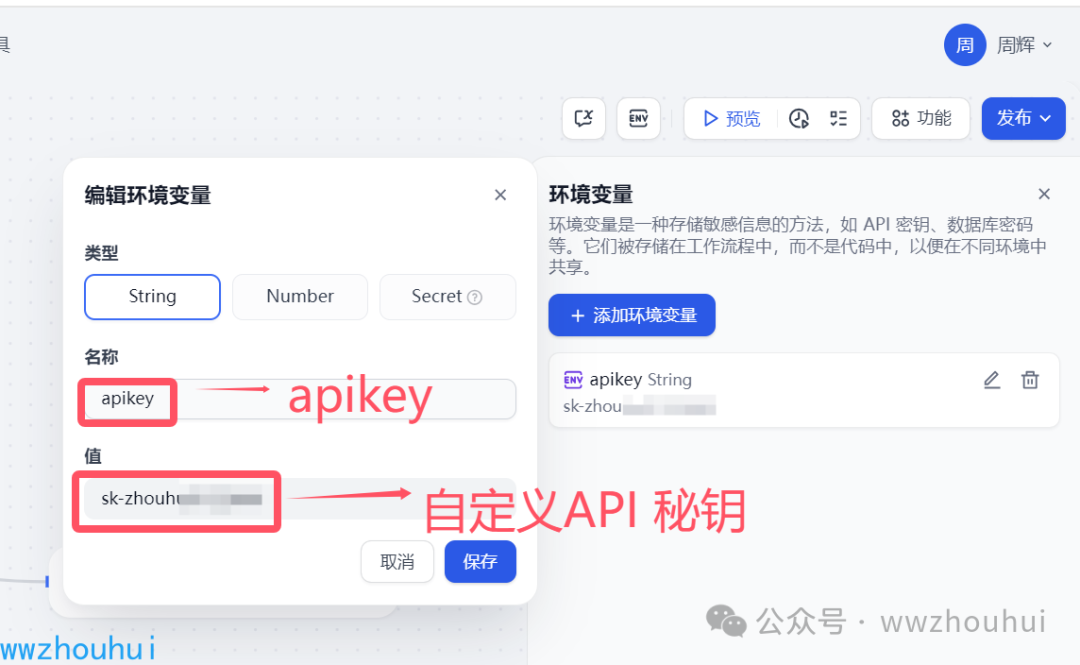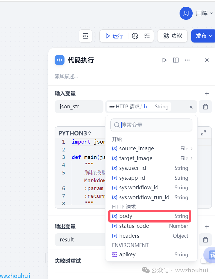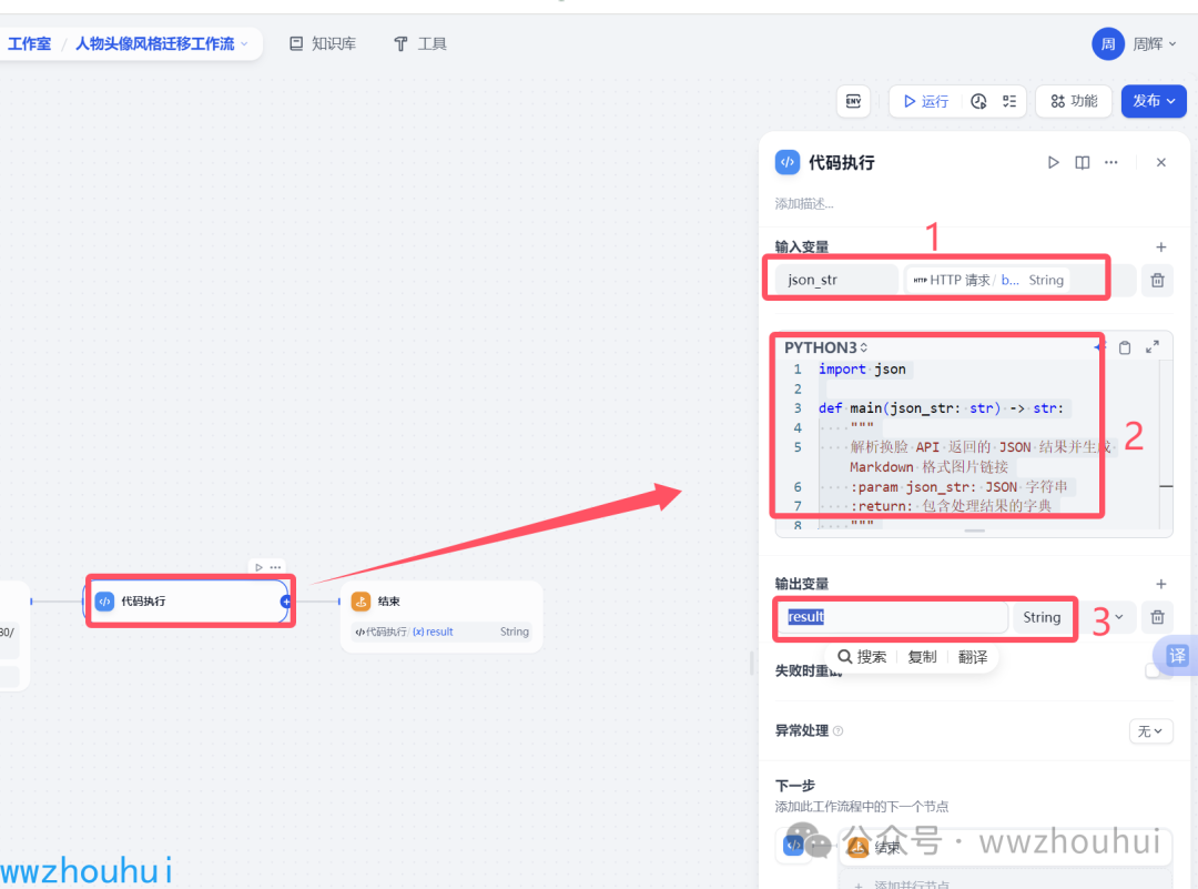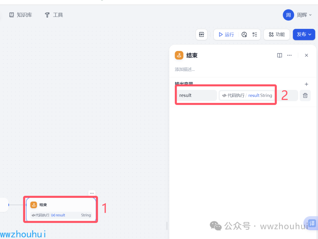 这个结束就是和普通工作流非常类似,其中 输出变量是result, 返回的值是代码执行转换输出