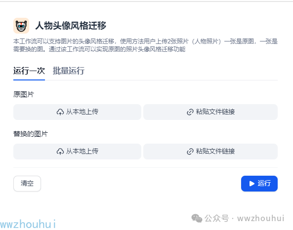 目前市面上有很多风格迁移的AI工具实现上述效果,比如用户上传一个卡通风格的头像,可以用它迁移成粘土风格卡通头像。这个在各大平台颇受欢迎,今天就带大家使用dify来实现这个这个人物头像迁移的工作流。