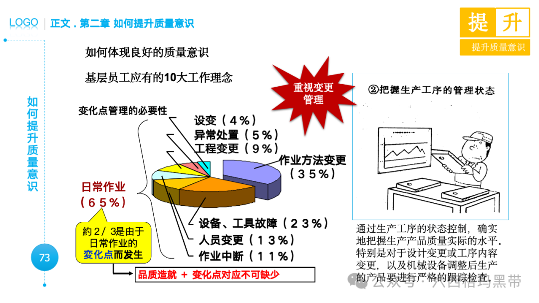 • 作业条件变更时的预先对策:员工需要在作业条件发生变化时,提前制定应对措施,确保质量不受影响。例如,企业可以通过设备维护计划、材料检验计划等方式,确保设备和材料始终处于良好状态。
