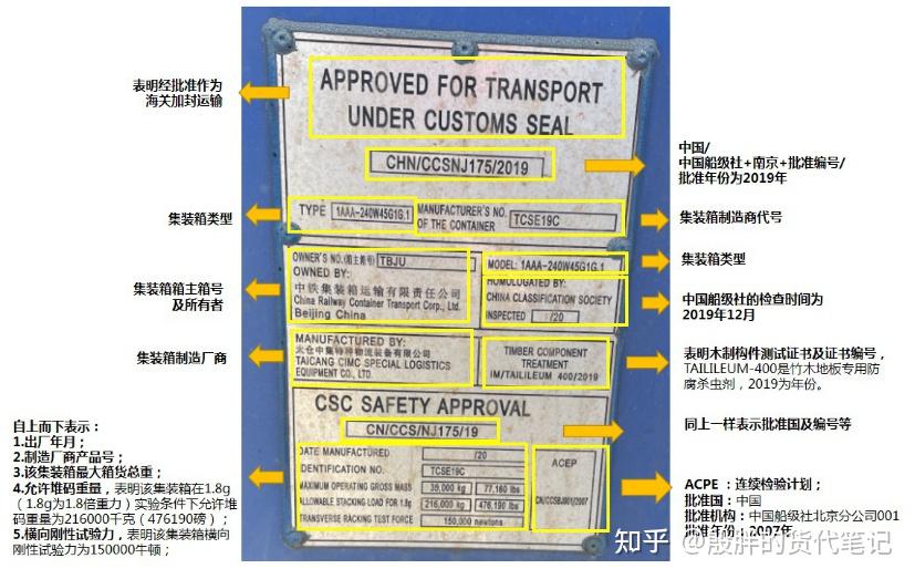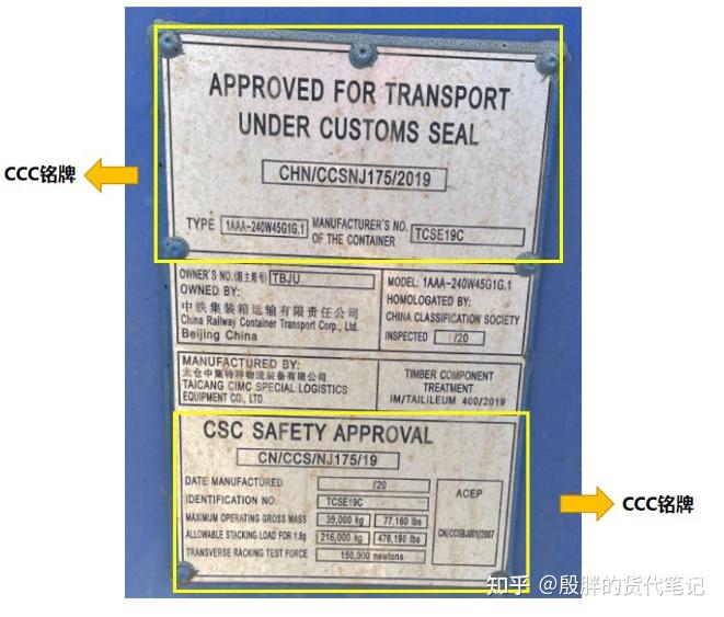 铁路集装箱的安全合格牌照一般为综合铭牌,其内容包含CCC铭牌(国际集装箱关务公约)和CSC铭牌(国际集装箱安全公约)。