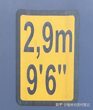 所有超过2.6米(8'6")高的集装箱,均需在集装箱的两侧张贴此标记。放置于距集装箱顶端1.2米、右侧0.6米的位置,样式为黄底黑字。标记上半部分数值以米为单位,下半部分则是转换为英制单位的数值。上图表示该柜高度为2.9M(9英尺6英寸)。
