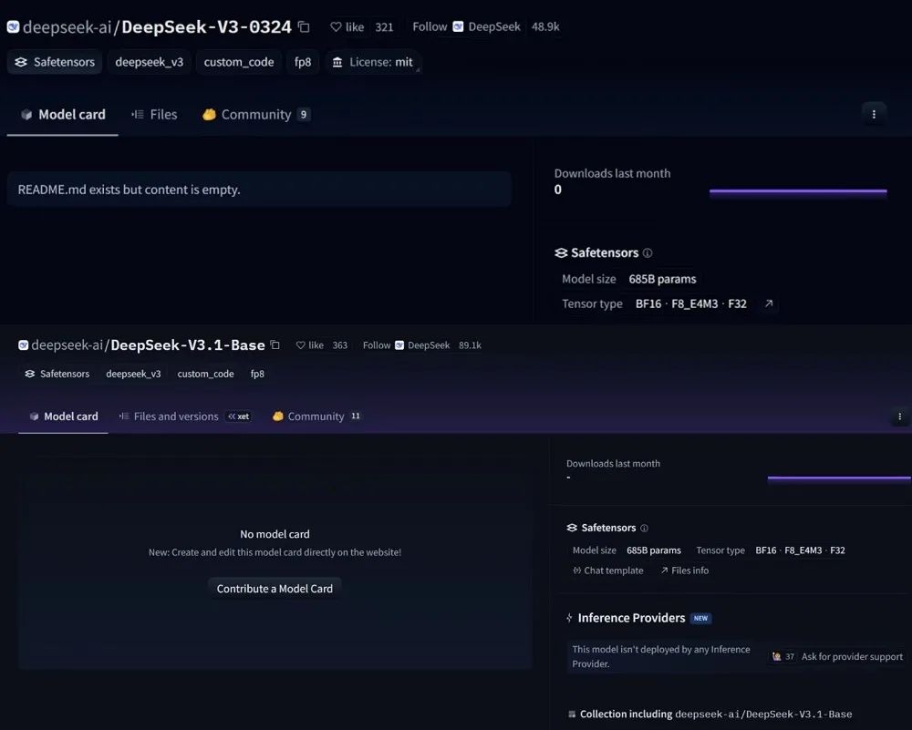 ▲上方为DeepSeek-V3-0324开源网页,下方为DeepSeek-V3.1-Base开源网页