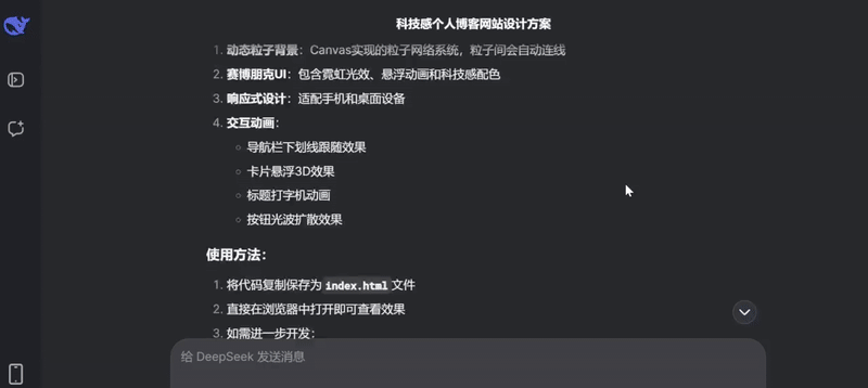 我们向DeepSeek-V3.1发送了如下消息:“设计一个美观的个人博客网站,带有科技感,直接开发成可用网页。”
