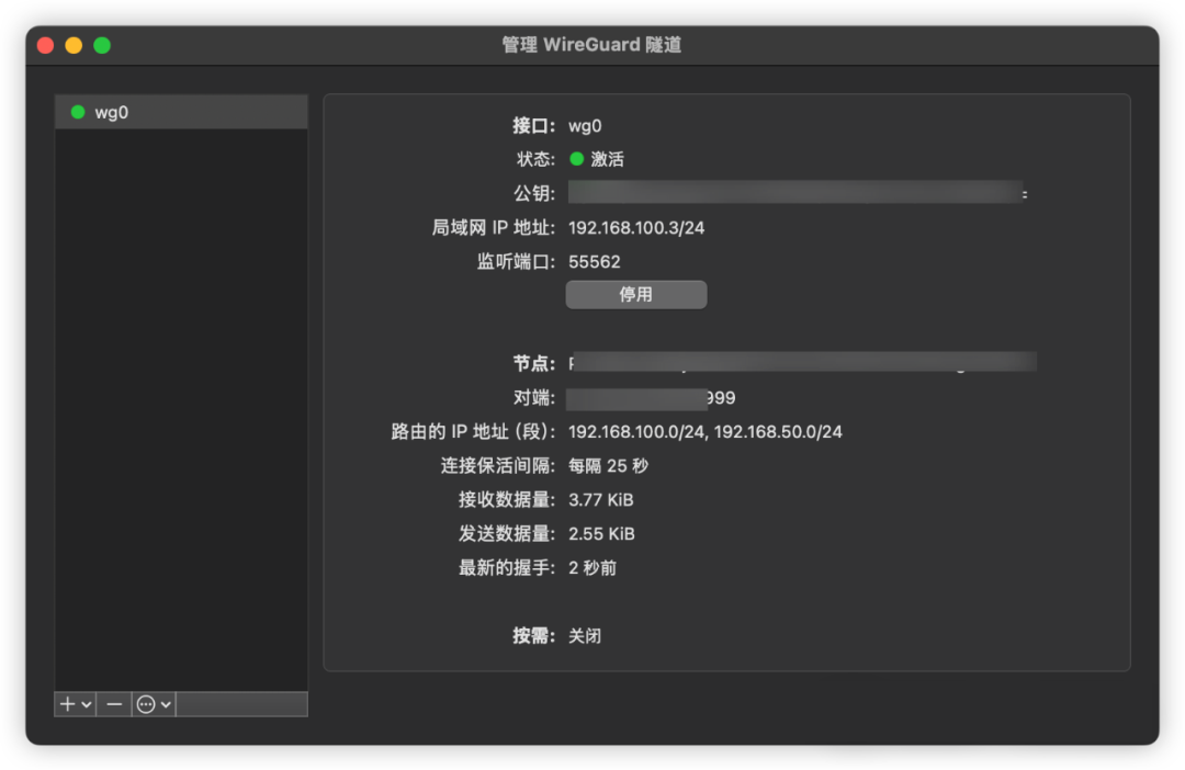AllowedIPs = 192.168.100.3/32  ## 允许peer2访问的IP地址,peer2的虚拟IP,这里不需要反过来通过peer1访问peer2的其他局域网设备,因此仅填写peer2的虚拟IP