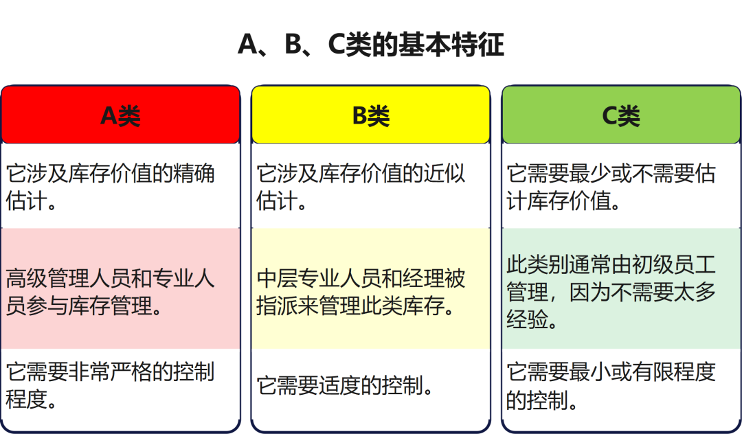 • A类:高价值/高周转的商品(占库存价值大,但数量少)