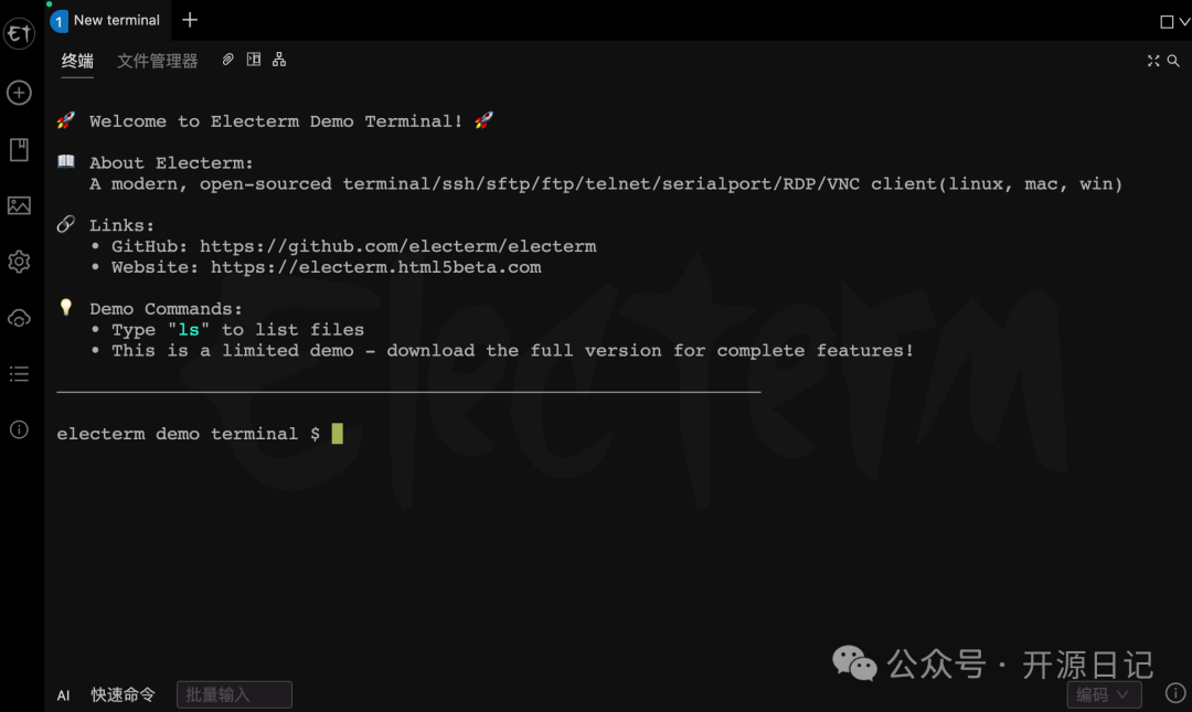 想用一个工具轻松搞定终端管理和文件传输,Electerm 是你的不二选择!这款开源项目不仅高度集成,让你的开发环境更加高效,它还提供了友好的界面、多语言支持以及丰富的功能扩展 。这种开源神器,不香吗?