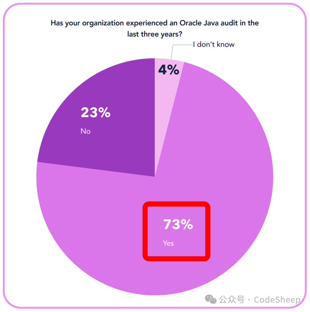 报告数据显示,在过去的三年中,受访的企业里有高达 73% 的企遇到过 Oracle 所发起的 Java 许可和合规性审计