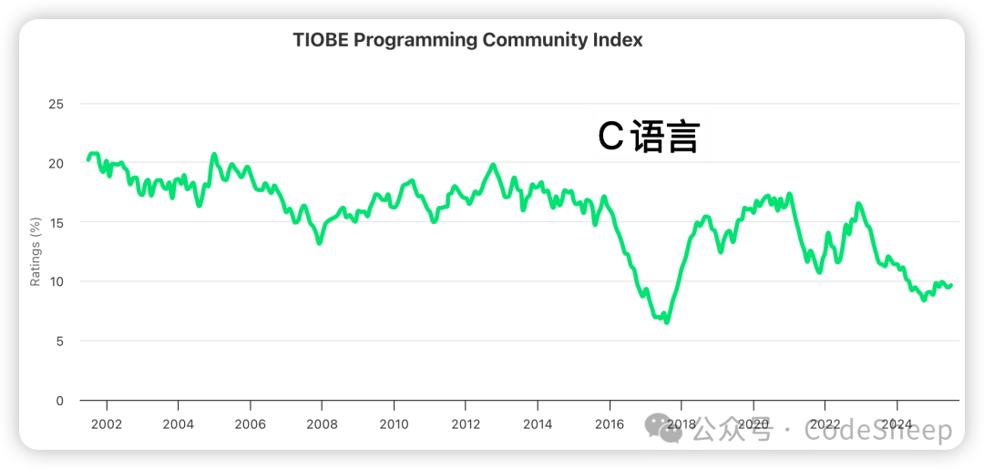 最近这几个月 C 语言的 TIOBE Index Ratings 比率一直在回升,这说明其生命力还是非常繁荣的,这对于一个已经诞生 50 多年的编程语言来说,着实不易。