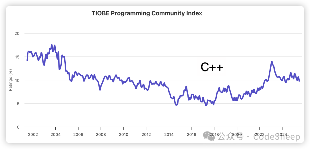 C++ 的确是一门强大的语言,但语言本身的包袱也的确是不小,而且最近这几年的指数趋势稳中求进,加油吧老大哥。