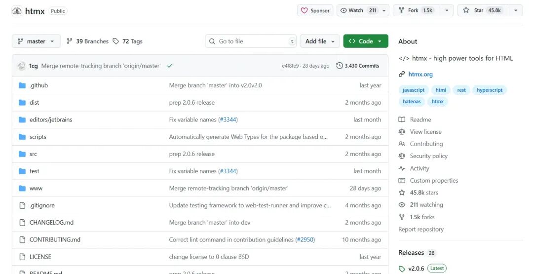 htmx是一个非常酷的前端工具,它让你在纯 HTML 中就能搞定 AJAX、CSS 过渡动画、WebSocket、服务端发送事件(SSE)等交互功能——而且不需要写一行 JavaScript。它体积超小(gzip 后约 14 KB),无任何外部依赖,还非常容易扩展,说它是超能力的 HTML 工具箱一点也不夸张