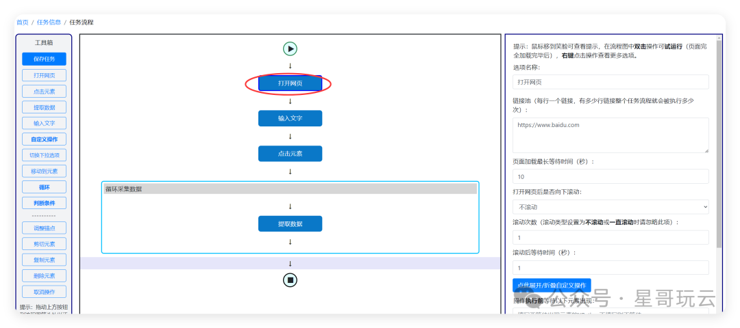 4.任务流程这里可以看到任务的详细流程,点击中间的“打开网页”等流程,在右侧会显示这一步的具体操作。