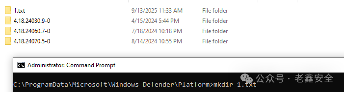 Windows Defender 始终阻止将文件写入其运行文件夹,“ Platform ”文件夹也不例外。 但是,如果是创建一个新文件夹而不是写入文件,会怎么样呢? 毋庸置疑,完全可以在“ Platform ”文件夹中创建任意名称的文件夹。 So,结合之前Windows Defender 如何过渡到新版本的信息,如果在“Platform”中创建一个以最高版本号命名的文件夹,Defender 会将这个文件夹用作其执行文件夹 之后,在“Platform”文件夹中创建一个指向新路径 (C:\temp\av) 的目录符号链接(SYMLINK )。确保 SYMLINK 名称对应于“ Platform ”中现有文件夹的最高版本号。例如,如果当前版本为“4.18.25070.5-0”,那么创建一个名为“5.18.25070.5-0”的 SYMLINK,以保证此 SYMLINK 具有最高的版本号。