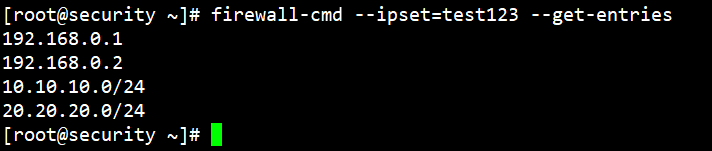 firewall-cmd --permanent --ipset=test123--add-entry=10.10.10.0/24firewall-cmd --permanent --ipset=test123--add-entry=20.20.20.0/24