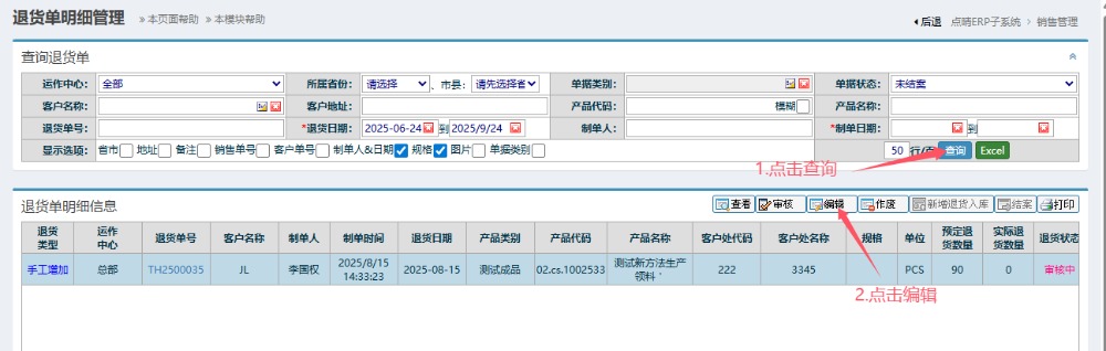 2.进入界面后,按图操作:先点击查询,然后找到对应退货单点击编辑。