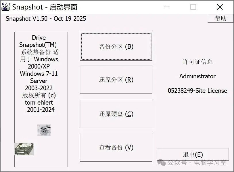 今天给分享一款小巧强大的系统备份还原软件--Drive SnapShot,v1.50.0.1748新版本(2025.10.19)。大小仅3MB,中文绿色便携版 支持Windows2000/XP,Windows7-11,Server2003-2022。