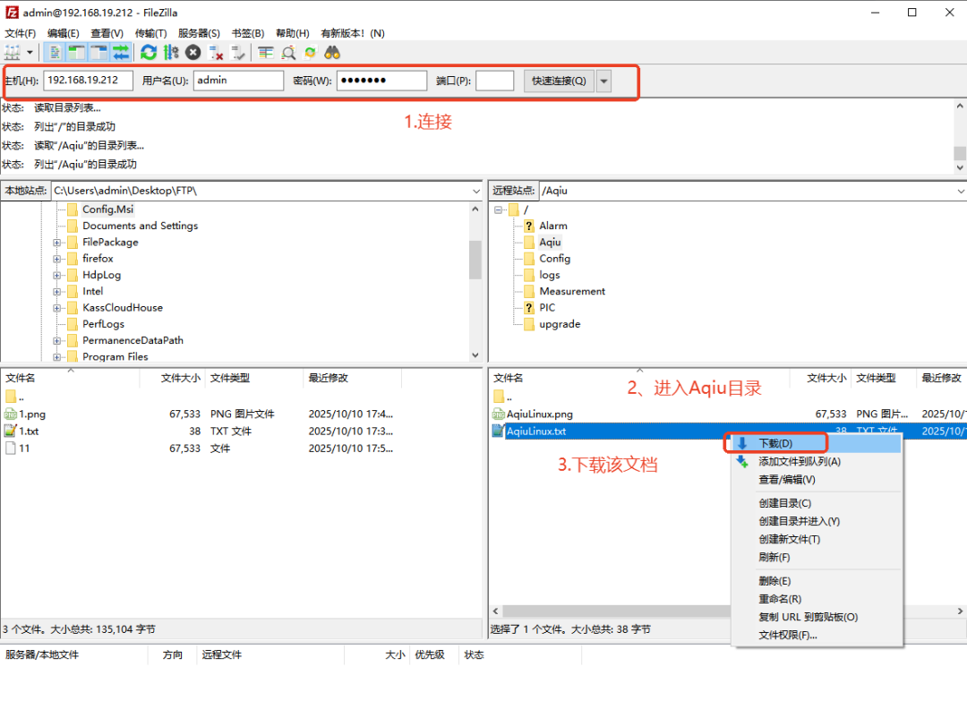 2.FileZilla Client客户端终端中,输入FTP相关信息后,进行连接,点开FTP服务器相关文件目录,下载文件等一系列操作,如下所示: