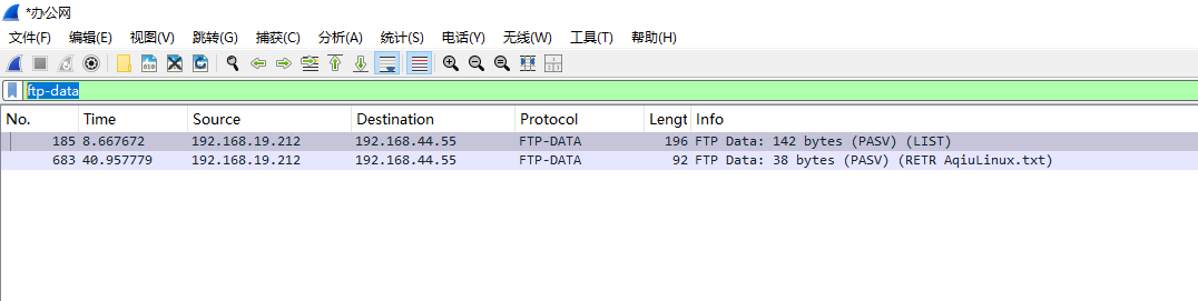 在 Wireshark 的显示过滤器栏中,输入ftp-data 并回车。会看到一系列数据包,协议显示为 FTP-DATA。这些包里面就承载着实际的文件内容。