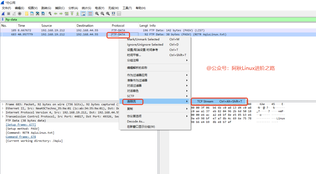 右键单击任意一个 FTP-DATA 数据包 -> Follow -> TCP Stream。