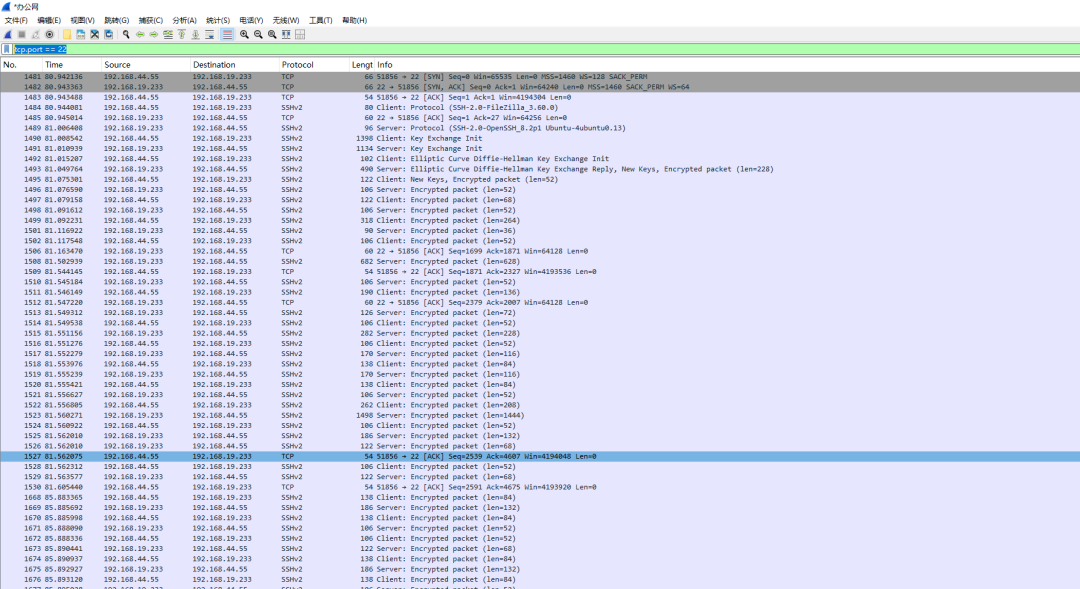 经tcp.port == 22 过滤,得到如下数据包:
